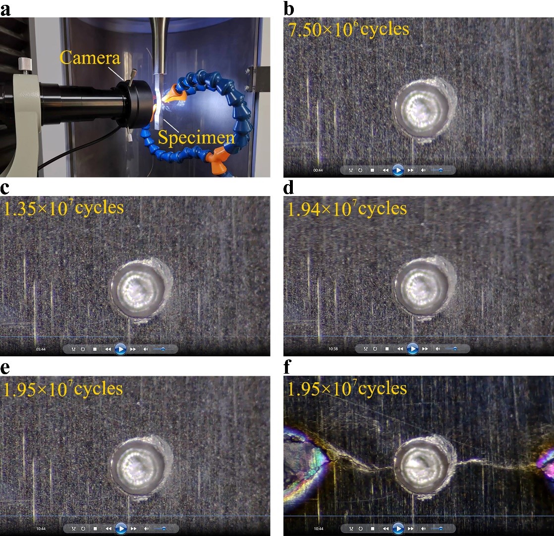 图5 含表面人工缺陷TC17钛合金超高周疲劳原位显微镜观测(σα=368 MPa, R=–1, Nf=1.95×107). 加载方向沿着纸面向上和向下.