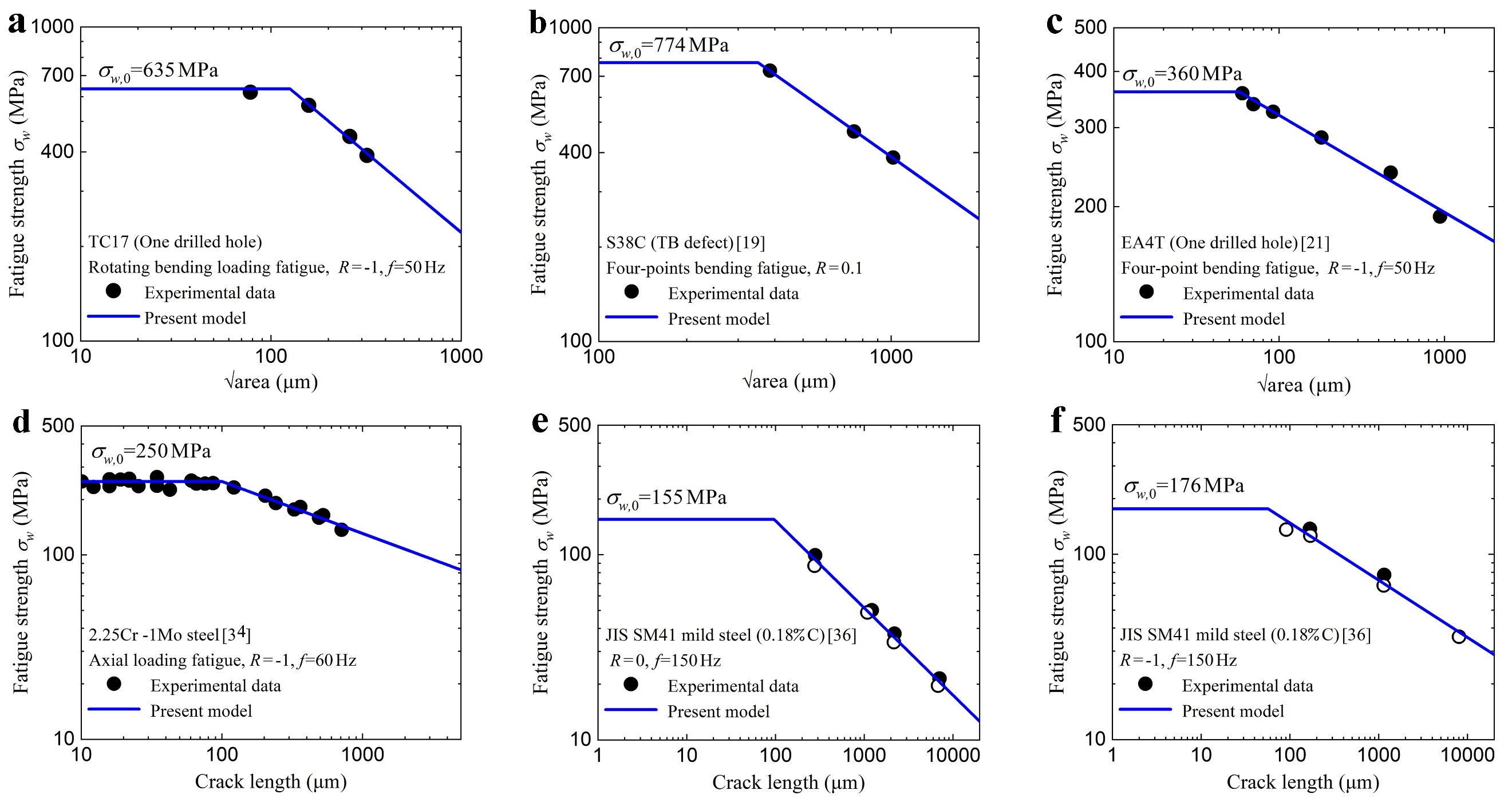 研究发现,材料缺陷不仅会显著降低钛合金的疲劳性能,而且缺陷对高周和超高周疲劳行为的影响与其引入形式密切有关。对于材料内部缺陷,高周和超高周疲劳S–N曲线呈现连续下降特征,而表面人工缺陷试样S–N曲线具有平台区特征(图4)。原位显微镜观测以及扫描电子显微镜和透射电子显微镜观测表明,与内部缺陷诱导的超高周疲劳失效不同,表面人工缺陷诱导的超高周疲劳未呈现伴随纳米晶粒形成的、缓慢的裂纹萌生和初始扩展过程;一旦裂纹萌生,裂纹将快速增长,试样在很少周次内发生失效(图5)。认为这种失效是疲劳载荷与时间相关过程(如水气影响、氢的作用等)的协同作用所致。进一步提出试样几何形状和表面缺陷对钛合金高周和超高周疲劳强度的影响模型。该模型不但能用于关联缺陷对钛合金疲劳强度的影响(图6a),而且也有效用于文献中缺陷(包括裂纹)对一些金属材料高周疲劳强度的影响(图6b-6f)。