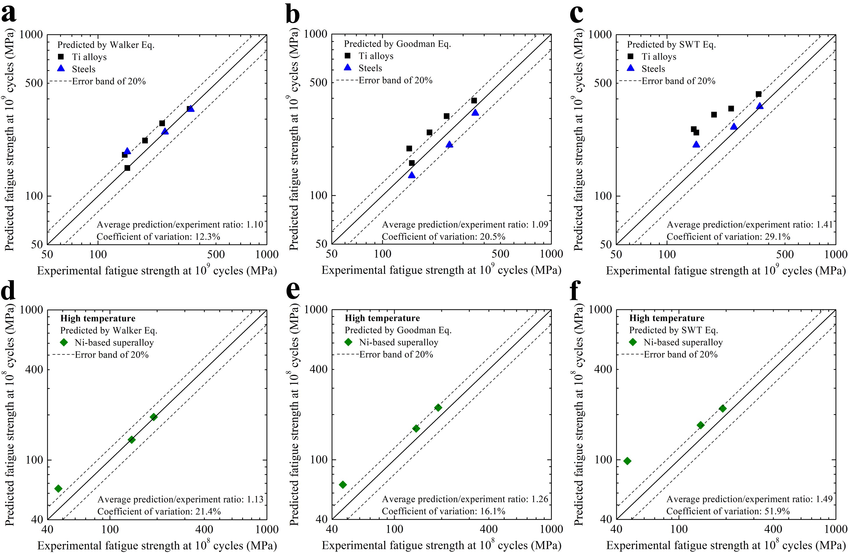 对几种常用的应力比对高周疲劳强度影响模型在超高周疲劳范畴的预测能力也进行了对比研究。多种材料实验数据表明,Walker公式σα,R=σα,-1[(1–R)/2]γ相比Goodman公式σa,R=σα,-1[1–(σm/σb)]和Smith-Watson-Topper公式σa,R=σα,-1[(1–R)/2]1/2更好地预测应力比对超高周疲劳强度的影响(图7),其中σα,R和σα,-1分别是应力比R和–1下的疲劳强度,σm和σb是平均应力和拉伸强度,γ是材料参数。