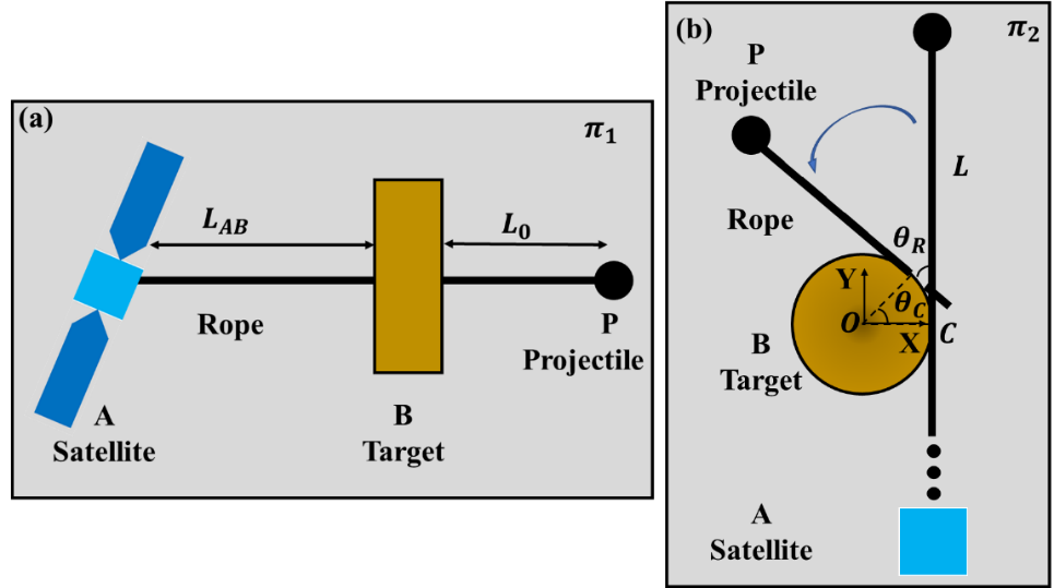 图1. 卫星通过系绳弹丸系统缠绕捕获目标对象的示意图。 (a)卫星A、目标对象B和B的纵向方向确定的平面π1;(b) 卫星A、目标对象B和B的横截面确定的平面π2 。
