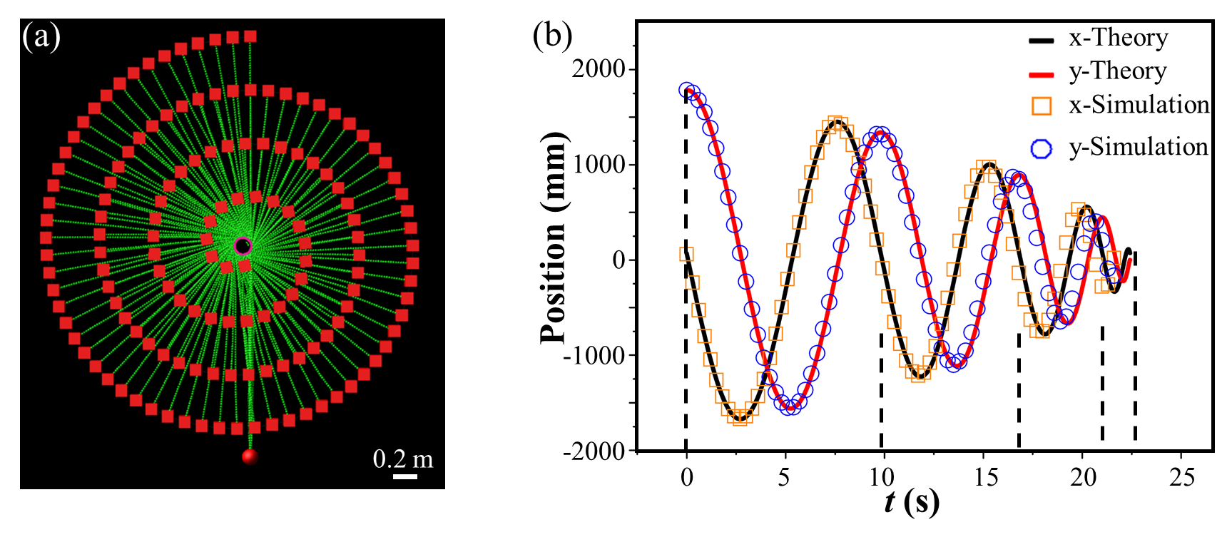 图2. 缠绕圈数n=4的模拟.(a)弹丸运动轨迹;(b)x、y方向的位移随时间变化与理论的对比。