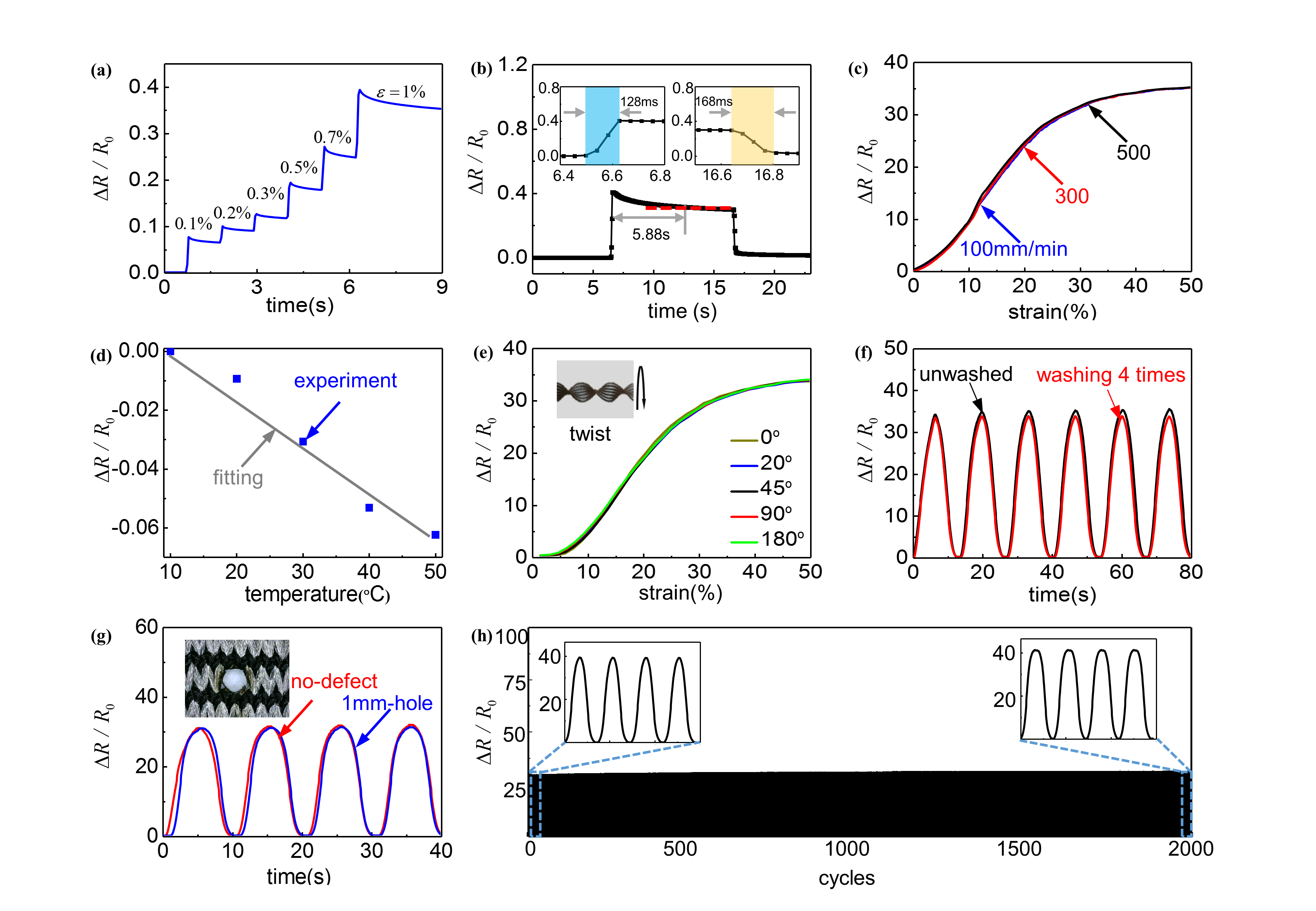 图3 应变传感器的动态性能及鲁棒性。a)传感器对小应变的响应,b)应变传感器的响应/恢复时间,c)加载速度对传感器信号响应的影响,d)温度对传感器信号的影响,e)扭转对传感器的影响,f)水洗对传感器的影响,g)微缺陷对传感器信号的影响,h)具有1-mm微缺陷的传感器在50%应变下的2000次循环加卸载。