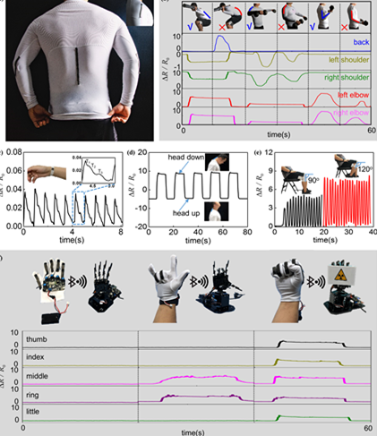 图4 编织应变传感器的代表性应用。a)传感器与健身衣的集成,b)正确与错误健身姿态下传感器的响应,c)传感器对脉搏信号的测量,d)传感器对颈部康复运动的监测,e)传感器对膝关节康复运动的监测,f)由该传感器制备的智能手套对机械手掌的远程控制。