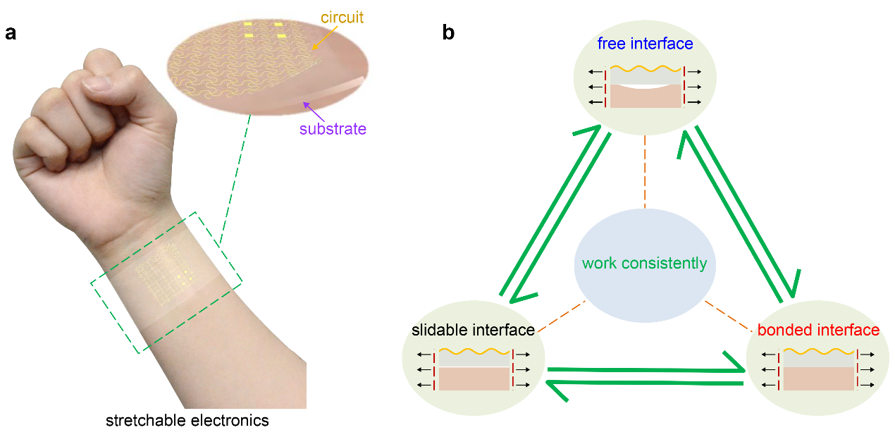 图1. 不同界面条件下的可拉伸无机柔性电子(a)可拉伸电子腕带作为示例;(b)电子器件在复杂界面条件(自由的、可滑移的或固结的)下的工作一致性需求