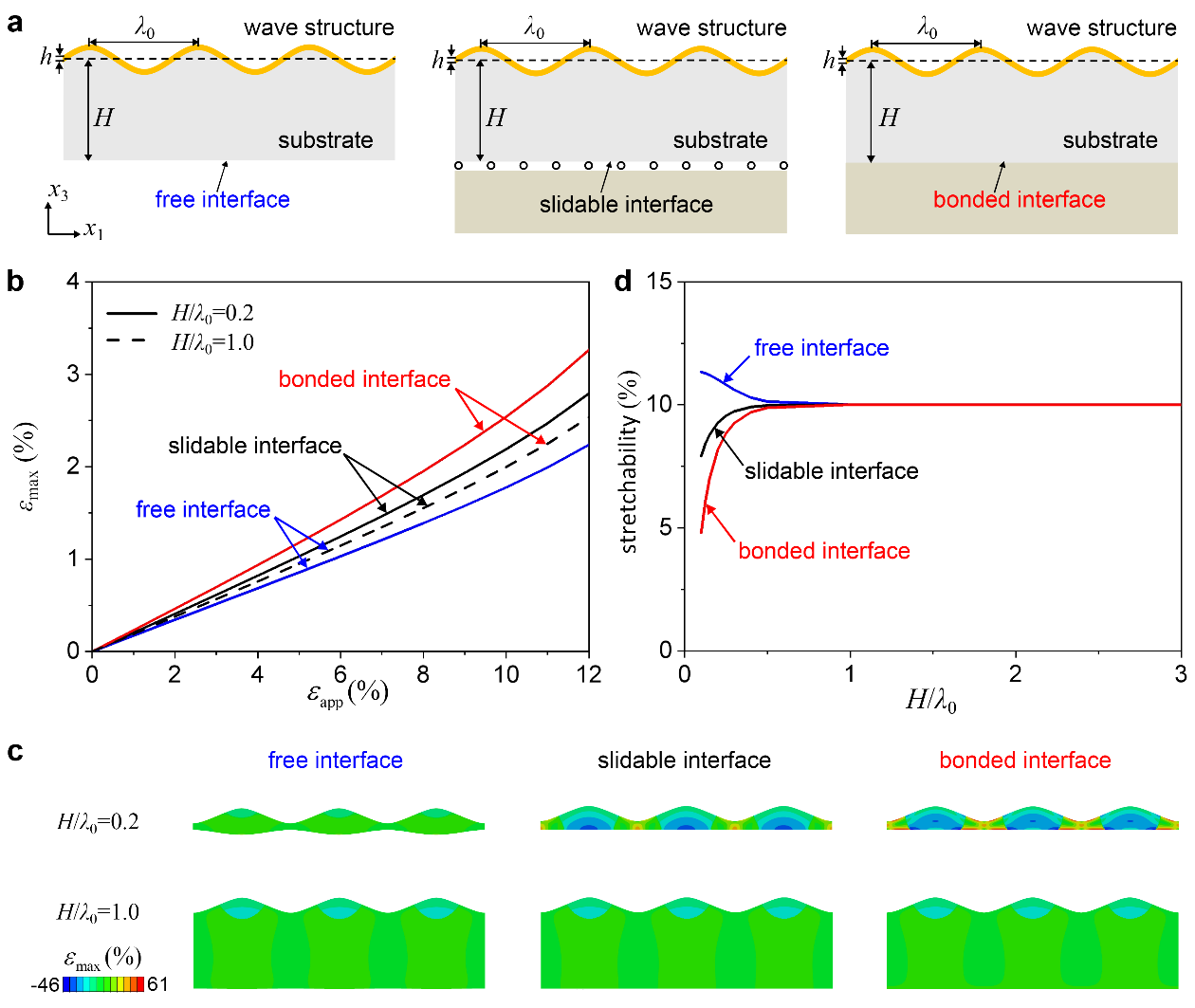 图2. 波浪结构可拉伸电子在不同界面条件下的分析(a)自由、可滑移和固结的三种界面条件;(b)三种界面条件下波浪状可拉伸电子的最大主应变随施加应变的变化曲线;(c)三种界面条件下薄/厚封装波浪状可拉伸电子的应变分布FEA结果;(d)三种界面条件下波浪状可拉伸电子的可拉伸性随封装厚度的变化曲线