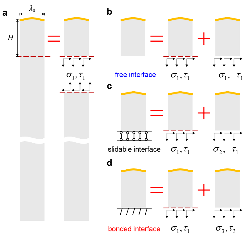图3. 可拉伸无机柔性电子的一般性应力分析(a)无限厚度的可拉伸无机柔性电子;在(b)自由、(c)可滑移和(d)固结界面条件下的应力分解