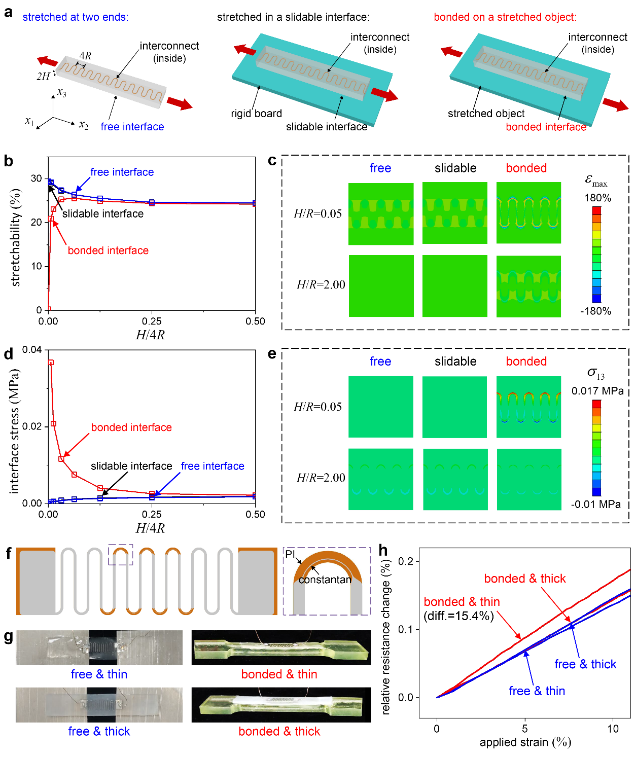 图4. 界面不敏感设计原理应用于蛇形结构的验证(a)自由、可滑移和固结的三种界面条件;(b)三种界面条件下蛇形结构的可拉伸性随封装厚度的变化曲线;(c)三种界面条件下薄/厚封装蛇形结构的应变分布FEA结果;(d)三种界面条件下蛇形结构与封装材料间的最大界面应力随封装厚度的变化曲线;(e)三种界面条件下蛇形结构与封装材料间的界面应力分布FEA结果;(f)带有偏轴康铜箔的蛇形结构的设计图;(g)薄/厚封装蛇形结构的拉伸试样,用于自由界面条件和固结界面条件;(h)薄/厚封装蛇形结构在自由/固结界面条件下的相对电阻变化随施加应变的变化曲线