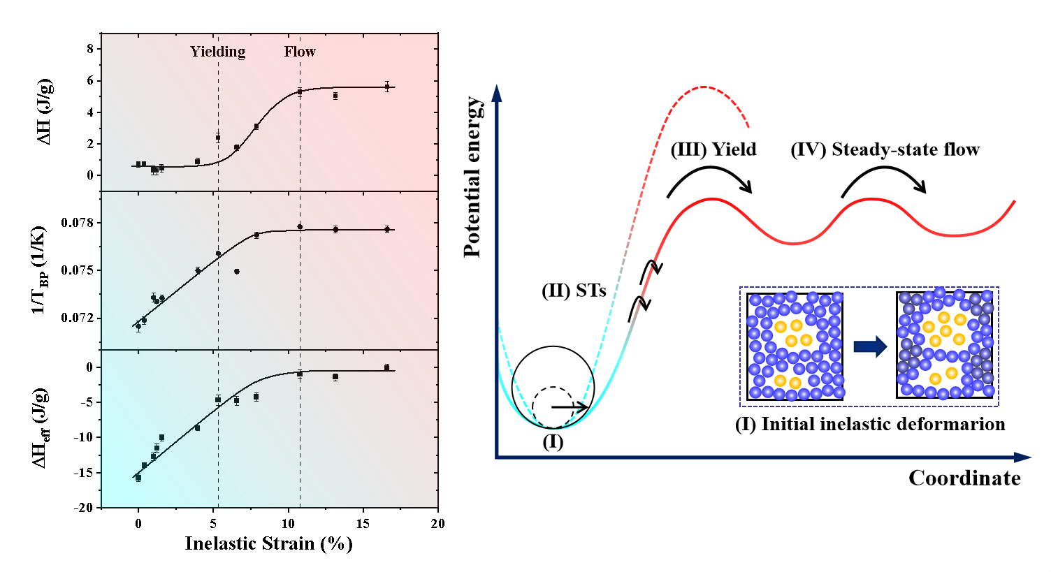 长程无序的玻璃物质,由于处于热力学亚稳态,其动力学具有自发的老化行为。玻璃老化常常伴随着物理、力学等性能的劣化。因此,如何使老化的玻璃态物质重新年轻化,实现性能的恢复,近年来得到了越来越多的关注,其中的关键是理解玻璃结构年轻化的物理机制。目前普遍认为,玻璃年轻化源于在外部能量激励下局域结构重排导致的自由体积产生;年轻化程度可定量表征为玻璃被加热至玻璃态转变前释放的热焓。但是,中国科学院力学研究所蒋敏强研究员等通过实验发现,该物理机制以及表征参数并不适用于严重老化的金属玻璃,从而不具备普适性。