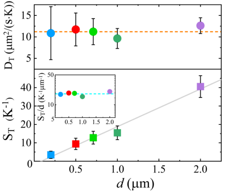 图2. 聚苯乙烯颗粒的热泳迁移率和Soret系数实验测量结果