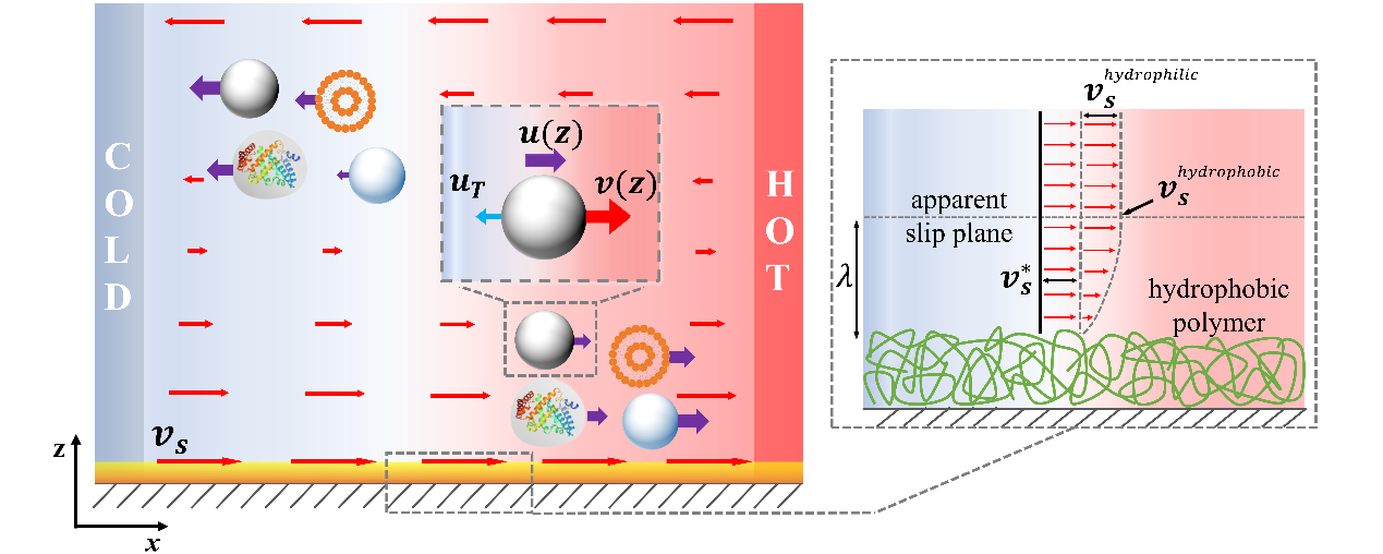图3. 受限空间的边界上产生热渗流可以调控颗粒的热泳,而通过边界滑移可以进一步增强该热渗