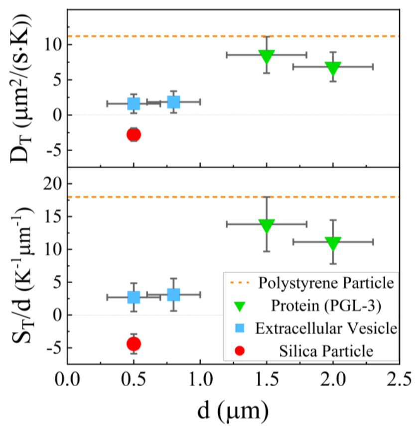 图4. 疏水蛋白质颗粒(绿色倒三角)的热泳比亲水外泌体(蓝色方块)快约4倍,而二氧化硅(红色圆圈)的热泳迁移率和Soret系数均为负