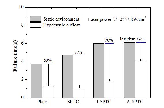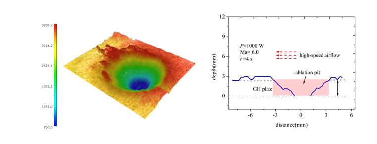 研究表明,在马赫6.0来流条件下,相同面密度的实心面板、空心点阵夹层板、隔热填充夹层板和烧蚀填充夹层板激光破坏时间分别比静态环境激光辐照下减小了69%,77%,70%和34%(图2),说明烧蚀填充夹层板在高速气流环境下具有更好的抗激光加固性能。对比该型结构在不同环境下激光烧蚀的宏微观形貌(图3),在静态环境下的激光烧蚀机理主要是氧化和升华,而在高超声速风洞内的主要烧蚀机理是剥蚀和升华。