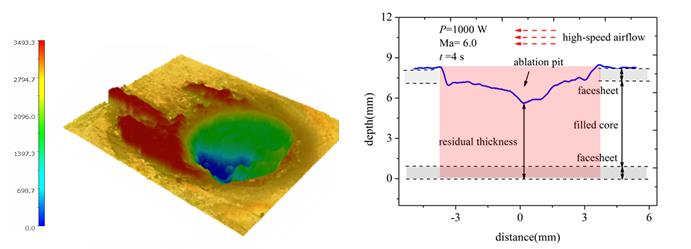 对比高超声速风洞条件下的激光烧蚀形貌(图4),传统实心面板在激光辐照2.33 s时击穿,而烧蚀填充点阵夹层结构即使在激光辐照4 s时也仅在辐照面发生微小损伤。因此,采用轻质烧蚀型材料填充点阵夹层结构可以在相同面密度即不改变结构质量的前提下,显著提升抗激光强度,延缓破坏时间。该研究成果为高速飞行器抗激光加固设计提供了新的方法与思路。