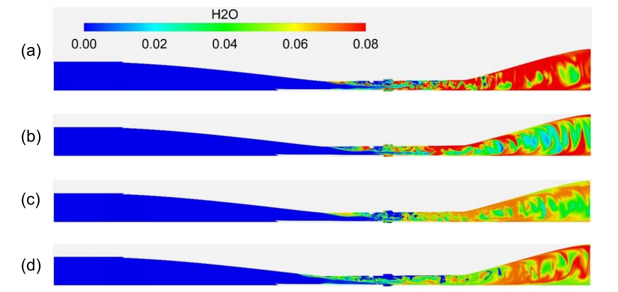 (1)揭示了在同一发动机流道不同阶段热力学非平衡截然相反的两种作用机制。在进气道等收缩管和近壁面边界层中,流动压缩和粘性加热使得动能转化为内能并被添加至平动-转动能量模态,热力学弛豫延迟的存在使得平动-转动温度(Tt)暂时高于热力学平衡温度(T),表现为有助于促进点火的非平衡加热效应(Tt>T)。与之相反,在尾喷管等扩展段内,流动膨胀将从平动-转动能量模态中提取内能并转换为动能,热力学弛豫延迟的存在意味着振动-电子能量模式不会立即补偿热力学非平衡状态,从而使得平动-转动温度暂时降低到其平衡值T以下,表现出抑制燃烧的非平衡冷却效应(Tt<T)。之前不同研究者得出的看似相反的结论其实源自于对发动机不同流动阶段的观察,结论本身相对观察对象而言都是正确的。本研究也表明了开展全尺寸发动机内外流耦合一体化模拟的必要性,避免“盲人摸象”式结论的产生。