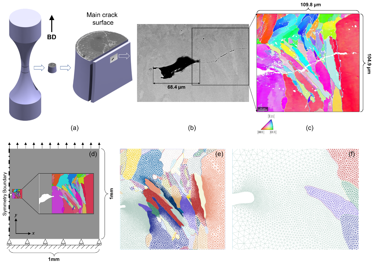 (1)捕捉到了超高周疲劳早期的裂纹萌生/扩展过程。揭示了增材制造铝合金的VHCF裂纹萌生/扩展机理,建立了1:1还原实验的缺陷、晶粒织构和载荷条件的有限元模型。