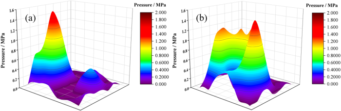图2. 弹道冲击作用下IMECAM(a)与EVA(b)缓冲层背部峰值压力分布图