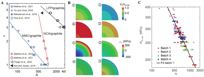曲线,(B)不同充放电进程的颗粒内锂浓度场和应力场分布,(C)基于电极颗粒内应力的锂电池寿命关系曲线