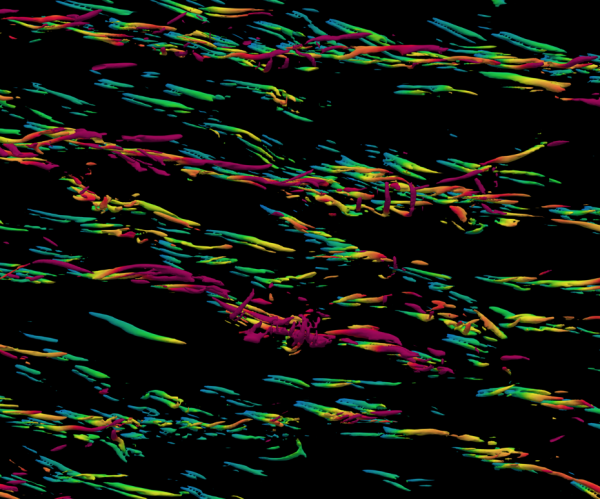旋转壁湍流中的壁面涡结构(俯视图),以壁面高度染色