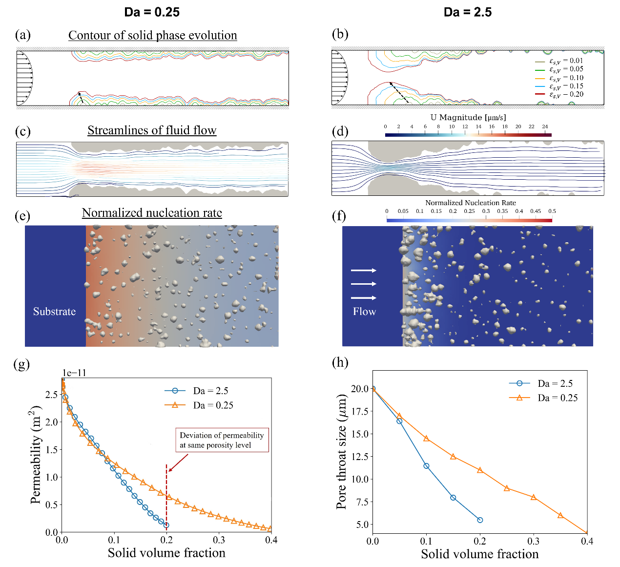 图1. Damköhler数对反应流中矿物结晶/沉淀现象及其导流能力的影响