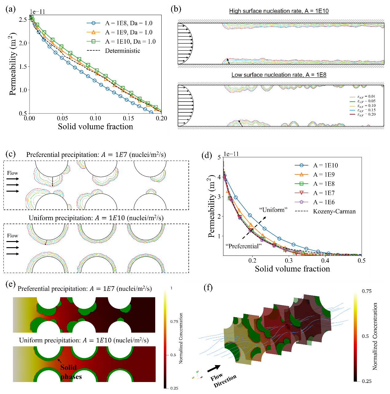 研究结果表明,孔隙反应流中固相沉淀的拓扑形态受Damköhler数调控,导致孔隙渗透率分异化,极大影响导流能力。此外,在固液界面相变反应速率一定的情况下,调整表面成核速率可以改变矿物沉淀的模式,从选择性沉淀转变为均匀性沉淀。通过与传统方法的对比,研究还发现过往确定沉淀速率的方法在特定情况下低估了孔隙渗透率。因此,在存在选择性沉淀和矿物与周围液体之间界面上的异质成核时,考虑微观概率性成核现象是至关重要的。这一研究为更好地理解矿物形成过程提供了新视角,进一步完善了孔隙反应流跨尺度相变理论体系。