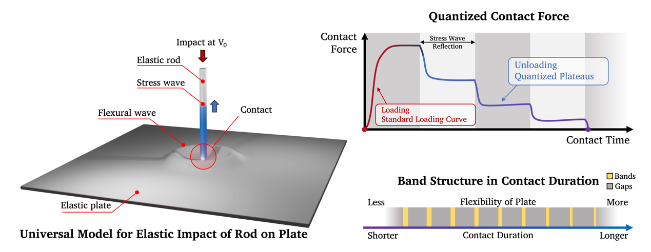 近期,中国科学院力学研究所和北京大学工学院研究团队基于板的接触动力学核函数和杆的波动方程,建立了描述杆板碰撞的无量纲延时微分方程,发现了杆板接触的加载普适性规律和卸载的“量子化”内禀特性,拓展了结构接触动力学的非线性碰撞理论。研究成果以“Quantized Impact of Rod on Plate”为题发表在固体力学国际期刊Journal of the Mechanics and Physics of Solids 上。中国科学院力学研究所彭青高级工程师为该论文第一作者。
