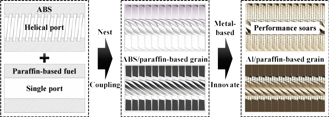 本工作提出双元推进剂特征界面驱动固液火箭发动机高效燃烧理念,首先完成金属基(Al90Mg10)多螺旋叶片骨架结构制备,通过内嵌高燃速石蜡基燃料,构建金属-石蜡界面以及复合药柱成型;然后通过实验研究,不仅全面评估了该复合药柱的力学及燃烧特性,还发展了高温高压内窥辐射成像及光谱测量技术,辨析了药柱燃烧过程中的火焰结构和金属燃烧行为。