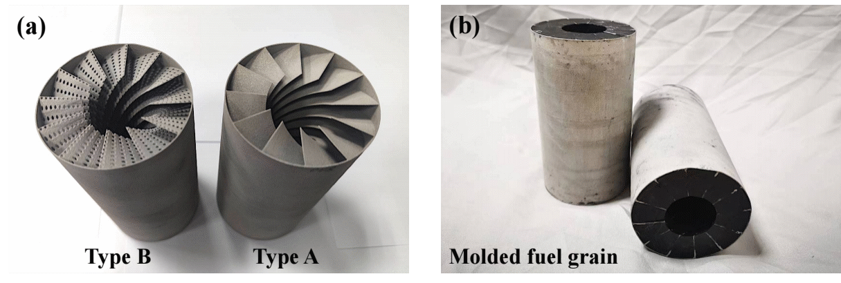图2 (a)有无二级结构修饰的金属螺旋结构基体和(b)嵌套石蜡基燃料成型后的药柱