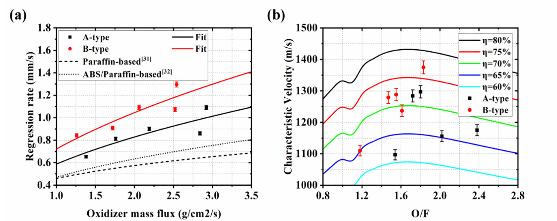 图3 (a)各型药柱燃面退移速率对比与(b)特征速度随O/F变化趋势