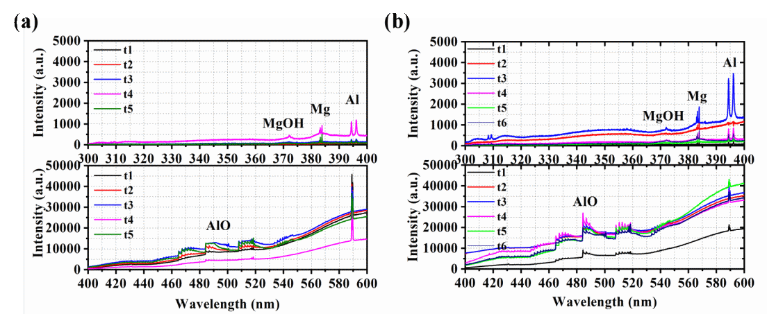 图5 (a)结构修饰与(b)结构未修饰下的固液火箭发动机燃烧过程羽流发射光谱结果对比