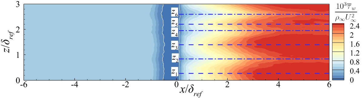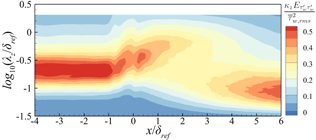 研究发现,相比于上游湍流边界层,干扰区壁面摩阻大幅度增加,且呈现显著展向异性,见图1。壁面摩阻的展向谱特性结果显示,上游平板边界层区域,能量峰值对应的展向波长为0.2倍的边界层厚度,对应100个粘性尺度;随着流动进入干扰区,含能波长大幅增加。上游边界层的峰值尺度与壁湍流近壁流向条带一致,而干扰区内峰值尺度与Görtler涡相关。