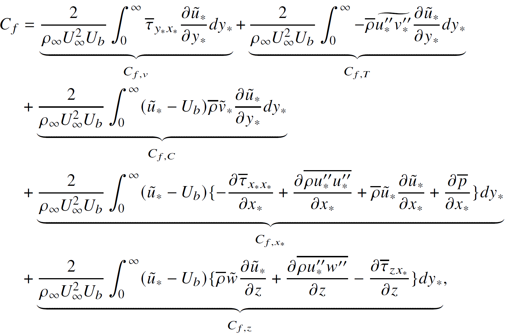 该研究以三维雷诺平均N-S方程为出发点,推导得到了基于能量守恒的壁面摩阻Cf分解方法,如下所示,