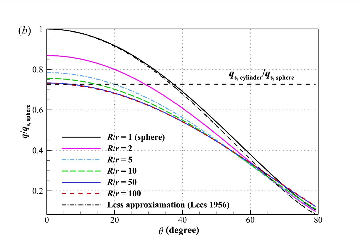 力学所高焓气动物理与应用研究团队基于主曲率坐标系推导了对称面边界层方程,并基于牛顿理论推导了高超声速条件下对称面边界层外缘切向速度梯度,进而可采用常用方法来将本文理论方程退化到ODE方程求解。该工作以“Hypersonic boundary layer theory in the symmetry plane of blunt bodies”为题发表在Journal of Fluid Mechanics期刊上。
