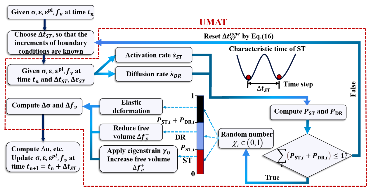 理解塑性,即固体如何流动,是一个经典力学问题。基于晶体学缺陷(如位错等)运动的传统塑性机制在面向非晶态固体这类无序介质时不再适用,而普遍认为非晶塑性的基本载体是原子或粒子以协同集团模式的局域剪切重排,即“剪切转变(Shear transformation, ST)”。类似晶体的位错运动,剪切转变本质上是一个非平衡的动力学过程:局域剪切重排可诱导弹性波在周围介质中非局域传播。基于平均场近似的连续介质模型通常忽略这种非局域效应,而将剪切转变看作无惯性的平衡过程,因此仅适用于准静态变形。由于时空尺度限制,原子尺度模拟无法捕捉剪切转变诱导的非局域弹性传播,也不能跨越到宏观变形。因此,如何从介观尺度,建立微观非平衡剪切转变与宏观动态变形的联系是亟待解决的挑战性难题。