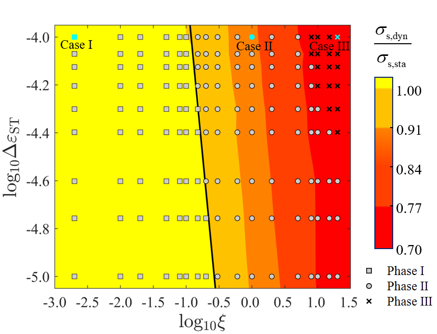 为攻克该挑战,力学所团队以变形惯性为切入点,建立了可精准描述非晶态固体动态变形的介尺度本构模型。在模型中,非晶态固体被离散为一系列介尺度模块,并考虑这些模块在时空尺度上的动力学非均匀性。通过采用剪切转变特征时间作为计算时间步,实现了介尺度模块在每个时间步内可根据各自的激活概率发生弹性变形、剪切转变或扩散重排。依赖于模块的激活过程,自由体积作为基本的结构参量被引入本构模型用于表征变形过程中的微结构演化。该本构模型被嵌入有限元软件,求解了一系列的平面应变压缩问题。通过定义两个无量纲数:应变增量和内禀德博拉数,模型预测了表征非晶态固体变形的相图,揭示了变形惯性涌现的临界条件。随着加载应变率提高或剪切转变时间缩短,显著的惯性效应会促进剪切转变的激活和非局域相互作用,导致非晶态固体提前屈服并进入更低应力水平的稳态流动。该本构模型还首次展现了加载冲击波直接激活剪切转变,从而形成塑性波前沿传播。这种变形行为完全不同于无惯性剪切转变自组装形成的剪切带模式。研究结果加深了对非晶塑性微介观非平衡过程的理解,也为描述非晶态固体变形的跨尺度模拟铺平了道路。