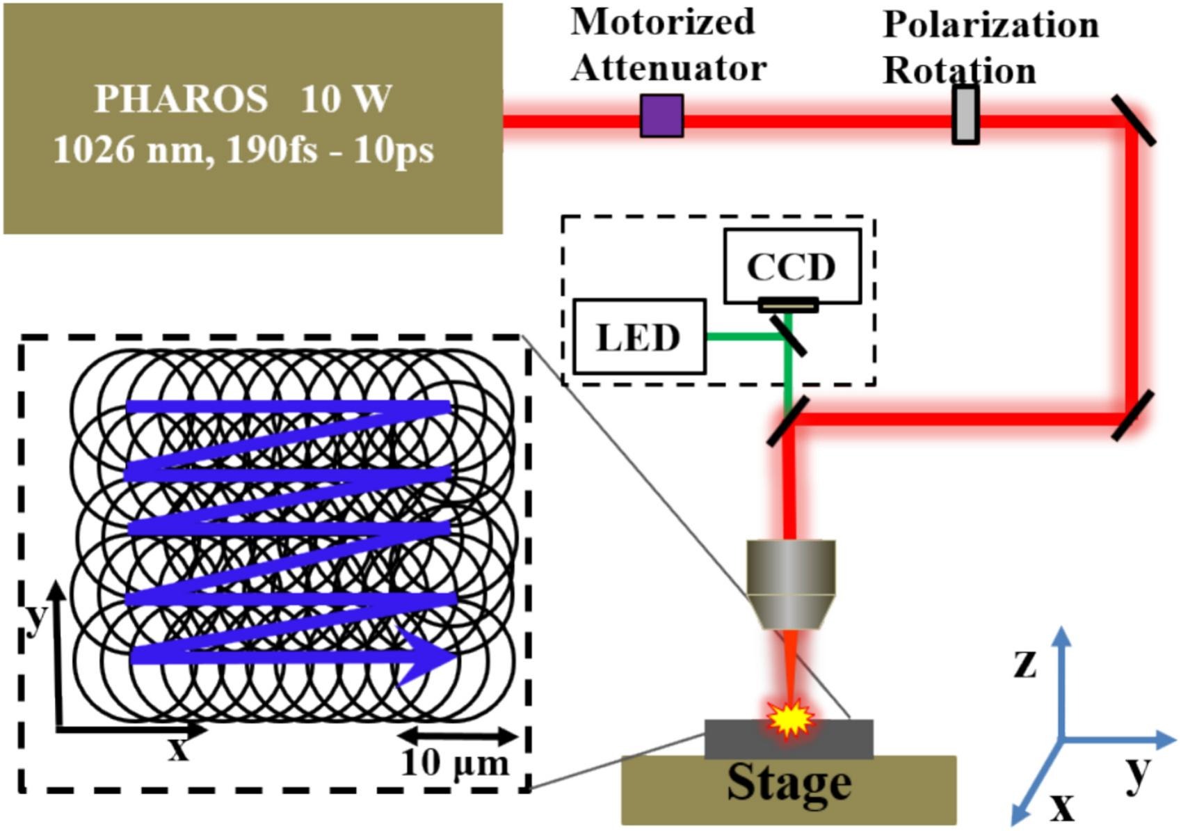 图1 超短脉冲激光剥离实验装置和激光扫描模型示意图