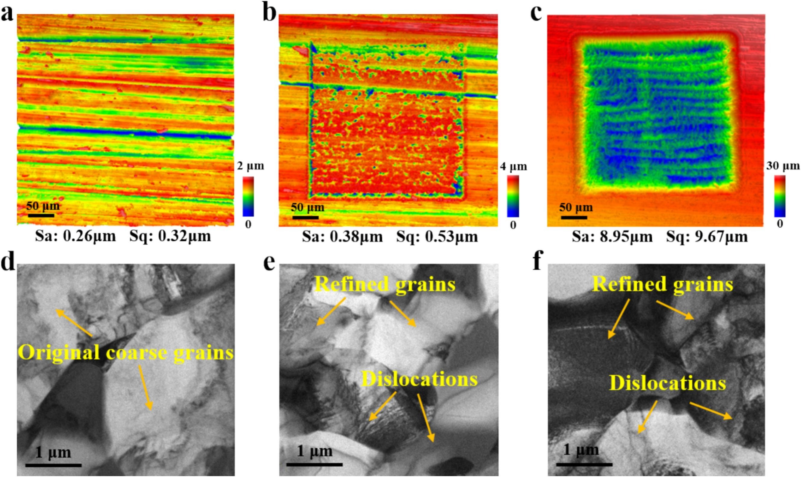 图2 原始和超短脉冲激光强化Ti-6Al-4V合金样品的表面形貌和微观结构比较。原始样品(a)、飞秒激光强化样品(b)和皮秒激光强化样品(c)的表面形貌。(d)原始样品、(e)飞秒激光强化样品和(f)皮秒激光强化样品表面的 TEM 图像。Sa:算术平均偏差。Sq:均方根偏差。