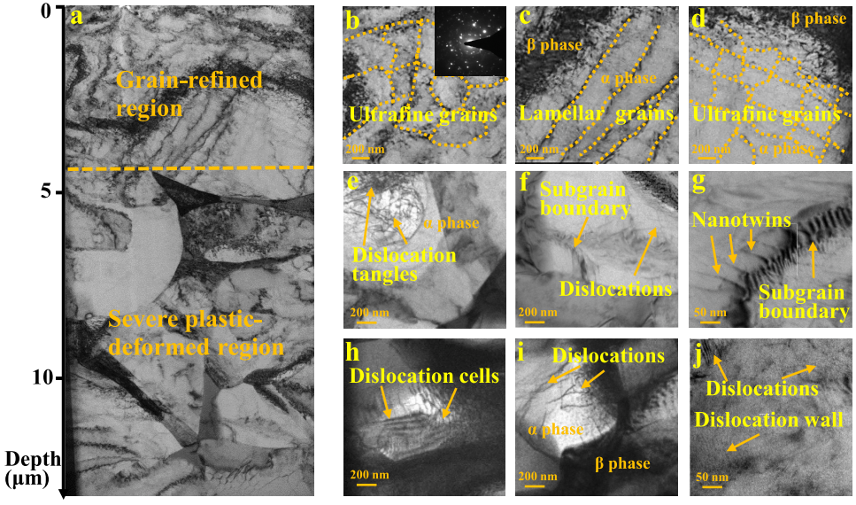 图3 通过飞秒激光喷丸处理产生的所研究的Ti-6Al-4V合金顶面(深度约15μm)上的梯度微/纳米结构特征。(a) 用 TEM 在深度方向上进行的显微观察。(b-d)靠近激光强化表面的晶粒细化区域的超细晶粒。(b) 中的插图表示细化晶粒的SAED图样。(e-j)飞秒激光强化引起的严重塑性变形区域的微纳米结构,包括位错缠结、亚晶界、纳米网、位错单元和位错壁。