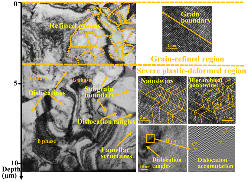 图4 所研究的Ti-6Al-4V合金通过皮秒激光强化产生的表面沿深度方向的梯度微/纳米结构的TEM特性,包括细化晶粒、层状结构、亚晶界、分层纳米网、位错缠结和堆积。高分辨率的TEM照片分别显示了晶界、纳米丝和位错缠结。放大方形区域的逆快速傅立叶变换(IFFT)图像显示了局部位错分布和堆积。