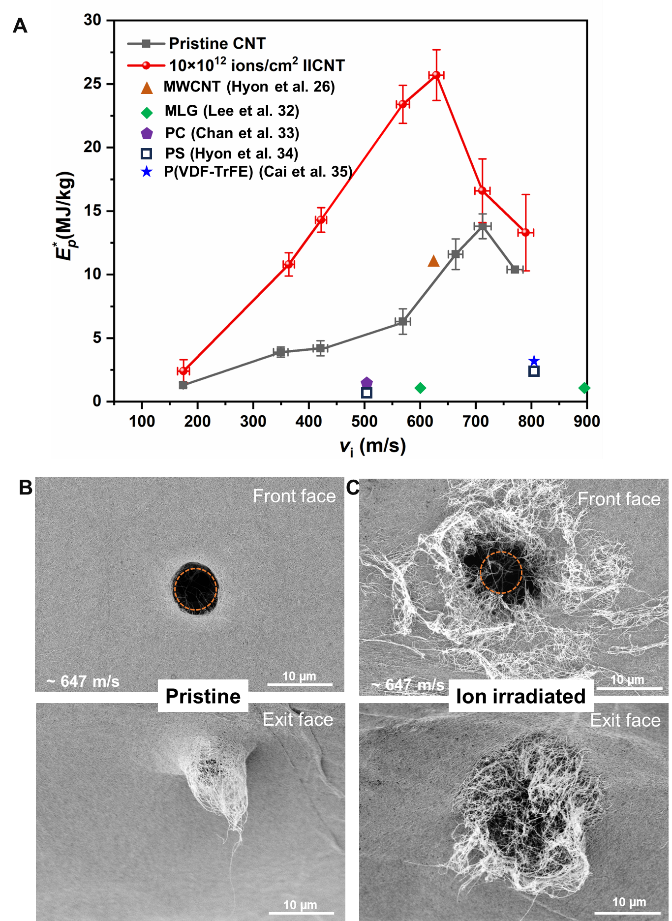 近日,力学所与Texas A&M University合作,以碳纳米管薄膜为研究对象,研究缺陷及界面对微纳尺度冲击防护性能的影响机制。碳纳米管薄膜是由无序多壁碳纳米管自组装形成的无序网络结构材料,是新一代防护装备的重要备选材料。研究团队通过高能碳离子辐照碳纳米管薄膜,在碳管中引入大量分布的原子尺度缺陷,虽然降低了单根碳管的强度,但是大幅提升了材料的冲击防护性能,使碳纳米管薄膜的冲击比吸能达到26 MJ/kg,突破了现有薄膜的比吸能记录(图1)。相关工作以“Load sharing and accumulated bond fracture in ion-irradiated carbon mat for energy dissipation”为题发表在Science Advances上。
