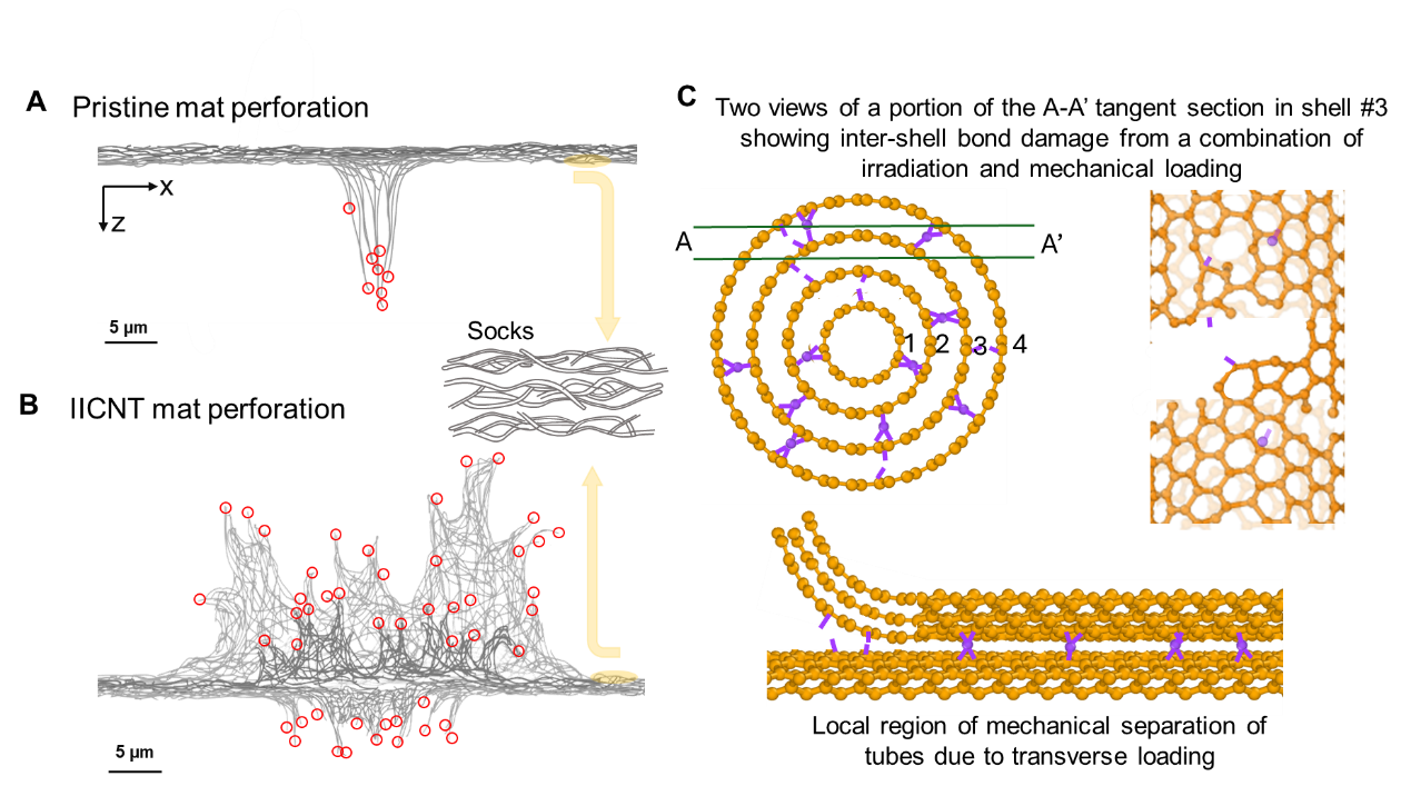图2. 薄膜变形形貌特征以及碳管内及碳管间键和缺陷的形成示意图。(A)原始多壁碳纳米管薄膜侵彻后的横截面。(B)离子辐照碳纳米管薄膜上部和下部大面积区域的回弹变形。红圈表示碳管和碳管束的断裂。(C)从原子尺度观察碳管内及碳管间的sp3键合(紫色),以及离子辐照和机械加载引入的sp2缺陷与失效特征。
