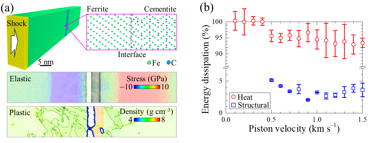 图1. (a)珠光体钢原子尺度结构模型;(b)热和结构耗散占比与冲击速度的关系