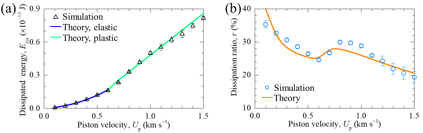 为攻克该挑战,力学所研究团队发展了珠光体钢的原子尺度冲击加载模型,建立了冲击过程的能量、动量守恒方程。研究表明,珠光体钢在冲击加载条件下的能量耗散可分为热和结构相关的两部分,前者起主导作用。在纯弹性变形情况下,能量耗散100%为热的形式。在塑性变形情况下,热耗散仍高达93%,与钢的塑性功转热系数(Taylor-Quinney coefficient)相当。由层裂引起的结构耗散在总耗散中的占比至多5%,而位错和剪切带等其它结构耗散之和不超过2%。耗散的能量在弹性变形时与冲击速度的平方成正比,而在塑性变形时与其线性相关。耗散相对输入能量的占比与冲击速度反相关,塑性机制激活后可短暂提升耗散占比。但由于塑性机制在受限空间迅速达到饱和,因而不改变耗散占比随冲击速度升高而衰减的总体趋势。该研究提出了一种量化冲击加载条件下能量耗散的系统方法,尤其关注能量耗散在绝热温升和以孔洞、层裂、位错、孪晶界以及剪切带为代表的结构冷功之间的分配,为防护及能量耗散工程结构的优化设计提供了理论支撑。