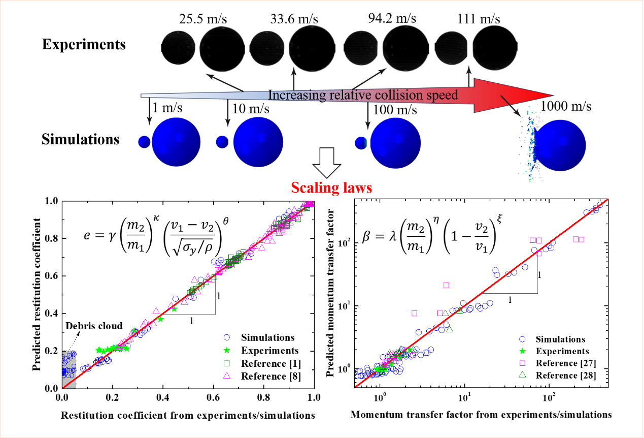 两动体对撞通常可由弹性恢复系数和动量传递系数进行刻画,前者反映了对撞过程中的能量耗散,后者则描述了对撞过程中两动体之间的动量传递。百余年来,基于赫兹接触理论发展的经典模型仅适用于低速的弹塑性对撞,而无法推广至包含损伤破坏的高速或超高速对撞。同时,由于尺寸缩比,基于伽利略变换的动撞静等效实验也无法直接应用于真实的动体对撞过程。因此,如果能找到两动体对撞的标度律关系,对于理解其背后的物理机制以及工程应用至关重要。