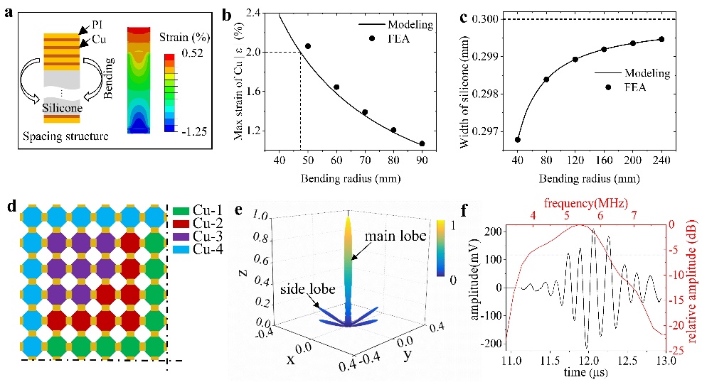 图3. BPAUT的性能。a)阵元连接结构的有限元模拟。b)Cu最大应变和弯曲半径的关系。c)阵元间距和弯曲半径的关系。d)144独立信号通路的布置。e)BPAUT的三维指向图。f)脉冲回波曲线