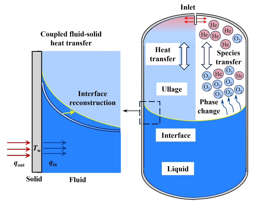 近日,力学所赵建福研究团队和上海交通大学吴静怡教授、杨光长聘副教授团队合作,基于开源计算流体动力学软件OpenFOAM,集成了界面重构、组分输运、相变和固液耦合传热等,系统模拟了地面常重力和空间微重力环境低温液氧贮箱内的气液界面与流场、温度场和浓度场分布等。该研究成果以“Numerical investigation on helium pressurization behavior of cryogenic propellant in microgravity”为题发表于国际热科学与工程领域顶刊Applied Thermal Engineering上。