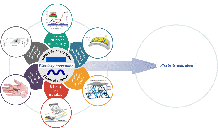图1. 利用金属材料弹塑性行为的柔性电子器件设计策略:从防止塑性到利用塑性