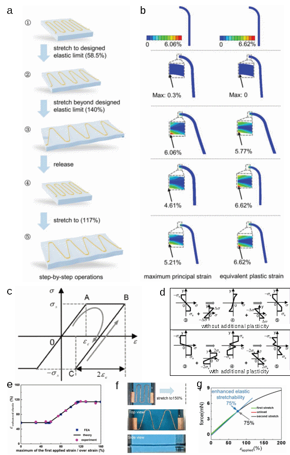 图3. 利用塑性演化提高弹性范围的创新策略。a, b) 可拉伸电子器件提高弹性可拉伸性的过度拉伸策略的逐步操作。c) 铜的理想弹塑性力学本构关系。d) 在有或没有额外塑性的情况下,过度拉伸过程中半圆顶点横截面的应力分布。e) 增强弹性拉伸性和第一次施加的应变/过应变的最大值之间的关系。f) 独立金属互连的初始状态图像以及拉伸150%时的正视图和侧视图。g) 增加的弹性可拉伸性为75%时的力-应变曲线
