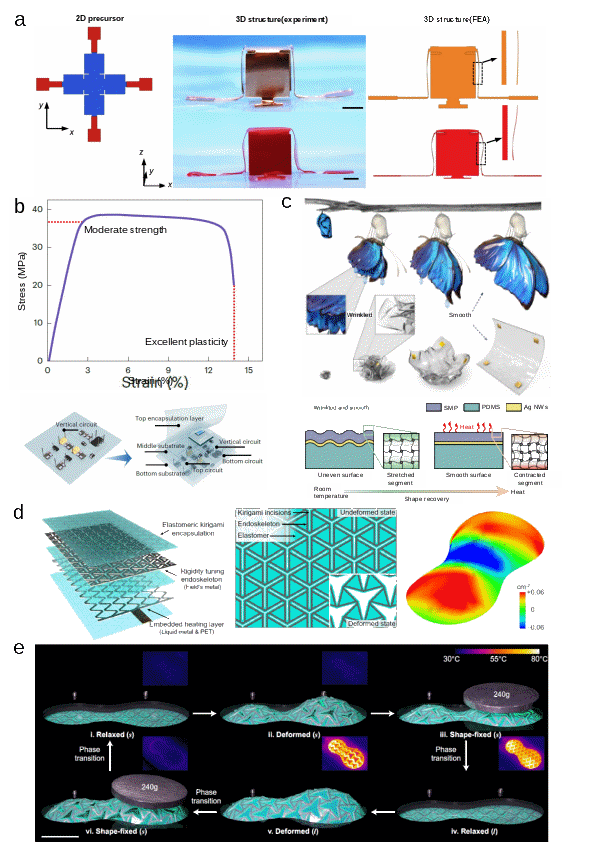 图4. 借助金属塑性形成功能结构。a) 利用金属材料的可塑性制造复杂的3D结构。b) 由具有调节塑性的液态金属制成的3D柔性电子器件。c) 可揉皱电子器件。d, e) 形状可调Kirigami复合超材料薄片