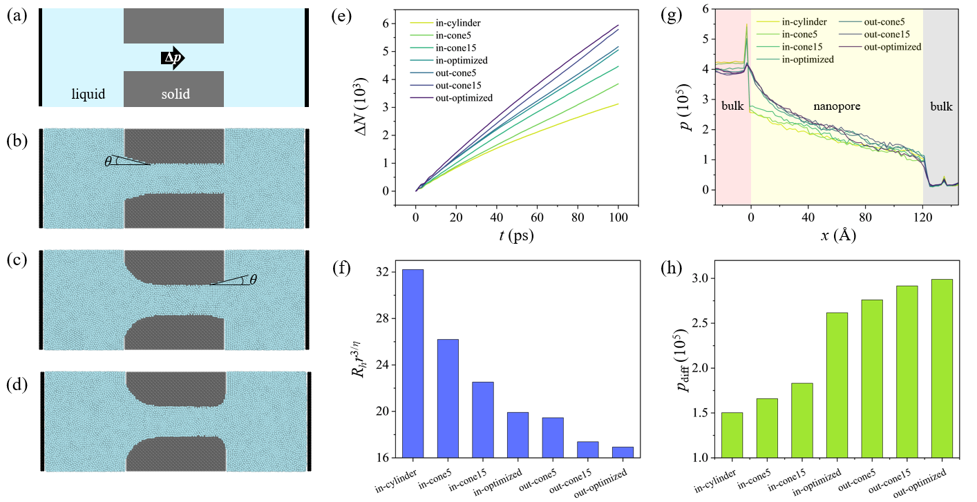 图2 不同进出口形状纳米通道的输运测试。(a) 模拟系统示意图;(b-d) 不同形状通道的原子视图;(e) 不同通道的累计通量变化;(f) 不同通道的水动力阻;(g) 不同通道的液体压强分布;(h) 不同通道的进出口压差