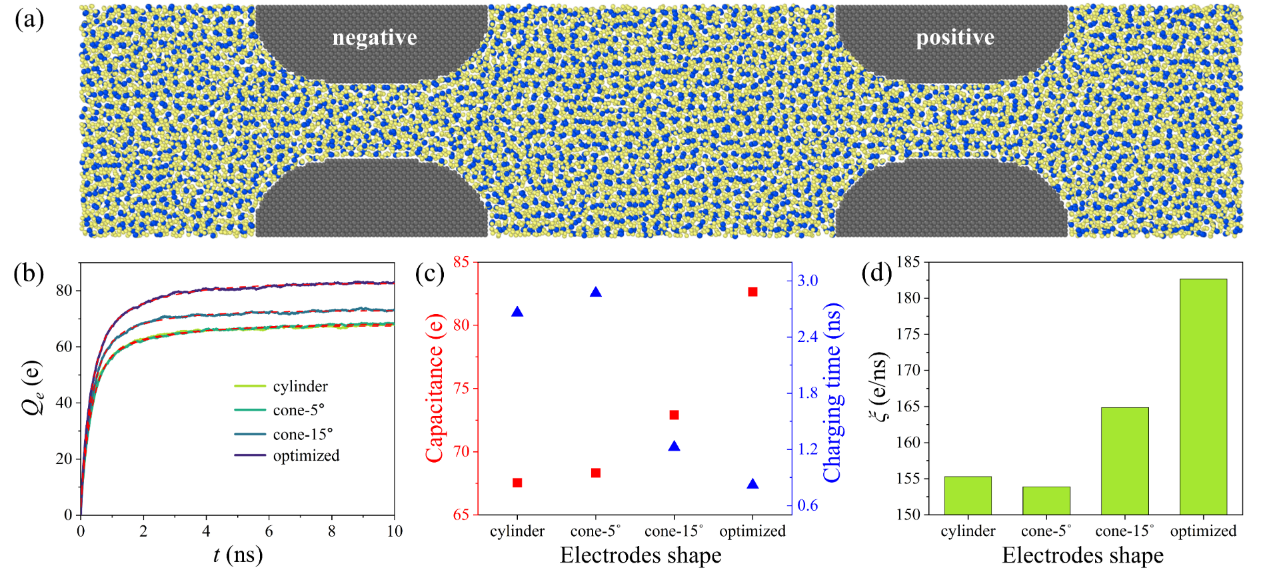 图3 不同进出口形状纳米通道的储能测试。(a) 模拟系统的原子视图;(b) 不同电极在充电过程中的总电荷演化;(c) 左:不同电极的电容量,右:不同电极的充电时间;(d) 不同电极的充电速率 ξ